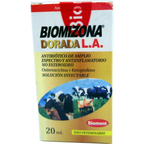 BIOMIZONA DORADA L.A. Esta formulada a base de Oxitetraciclina, en vehículo de larga acción; asociada a Ketoprofeno, un antiinflamatorio de última generación no corticoide, analgésico y antipirético, que no causa aborto. Por la formulación especial se obtiene un efecto prolongado con altos niveles plasmáticos durante 3 a 5 días después de su aplicación.
